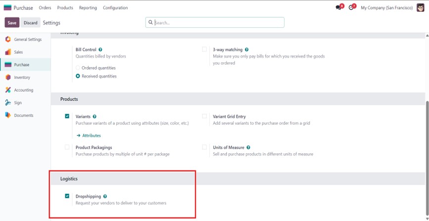 Purchase → Configuration → Settings → Logistics → Dropshipping