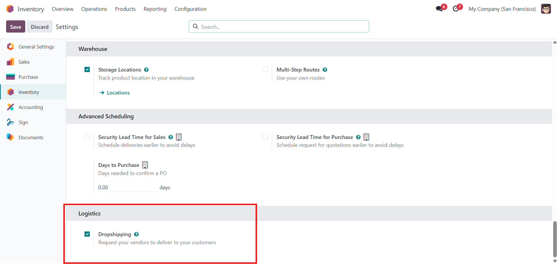 Inventory → Configuration → Settings → Logistics → Dropshipping