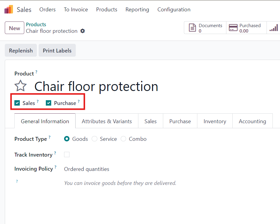 - On the product form, enable both Can be Sold and Can be Purchased.