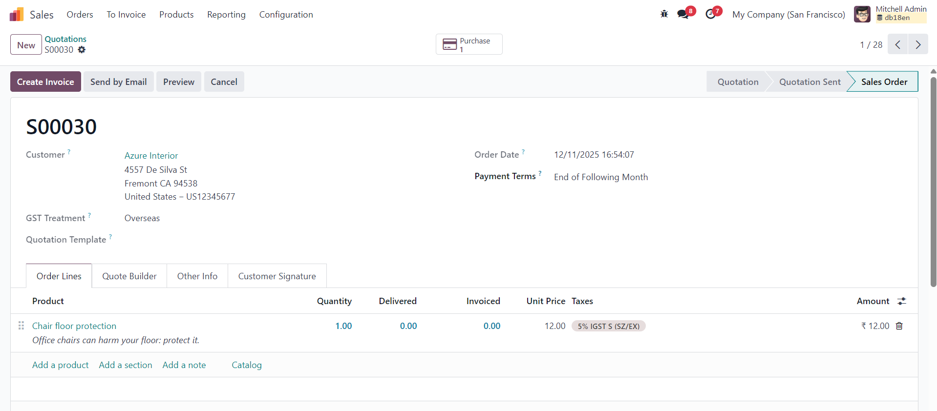 Once the product is fully configured for dropshipping, you can begin fulfilling customer orders with ease. Start by creating a new Sales Order in the Sales app, add the dropship-enabled product, and confirm the order. As soon as the sales order is confirmed, Odoo automatically generates a corresponding Purchase Order for the selected vendor. On the sales order, you’ll notice a small Purchase smart button (icon) appear at the top, which allows you to quickly access the linked purchase order. This automated connection ensures a smooth workflow where the supplier ships the product directly to the customer without involving your warehouse operations.