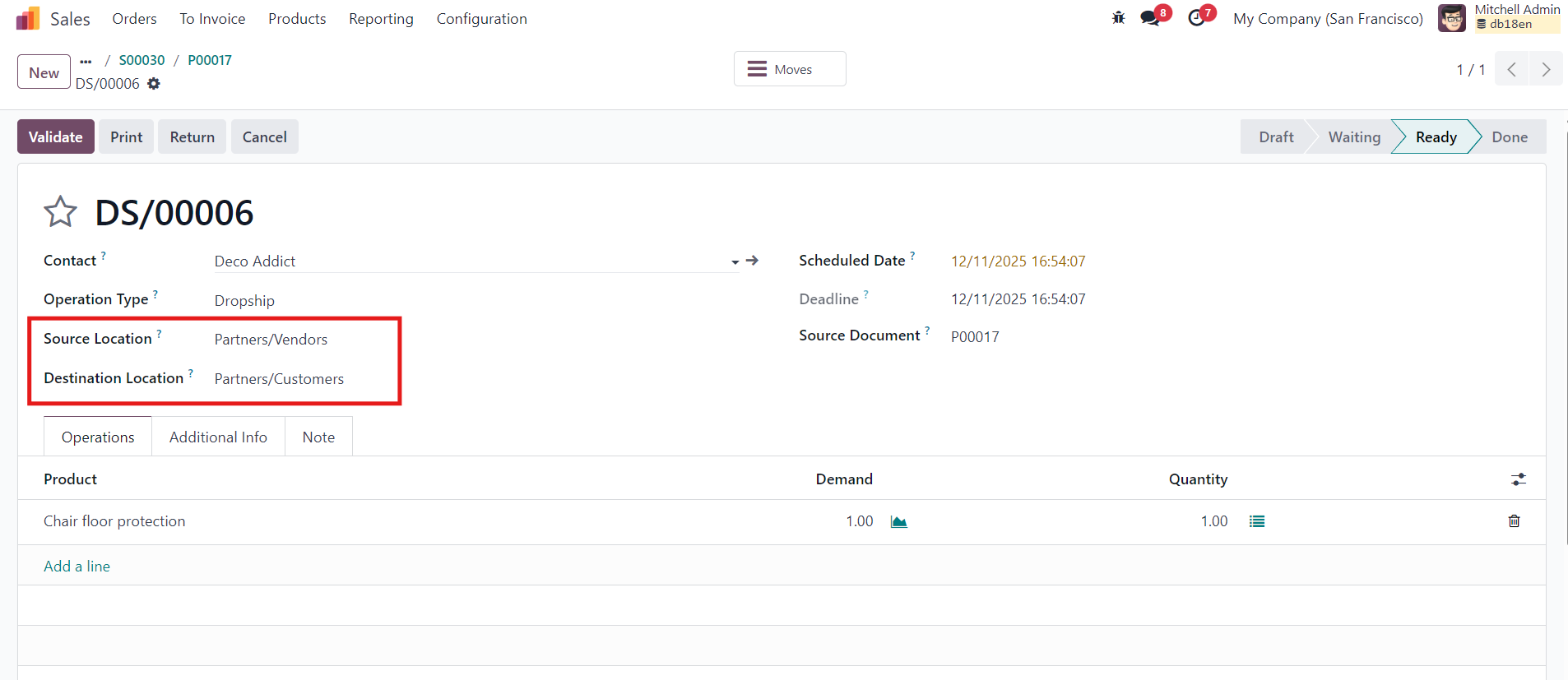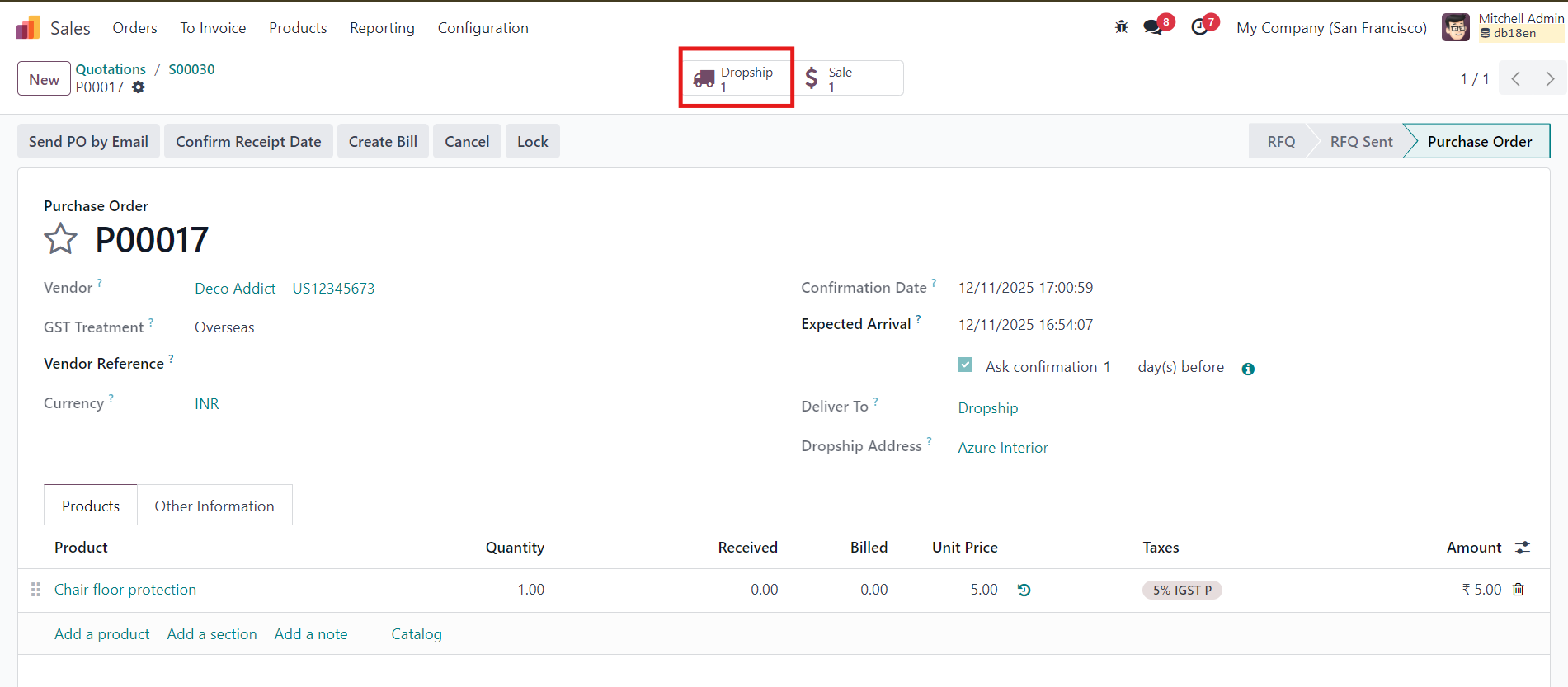 - Odoo will automatically generate a Dropship Receipt linked to this PO.